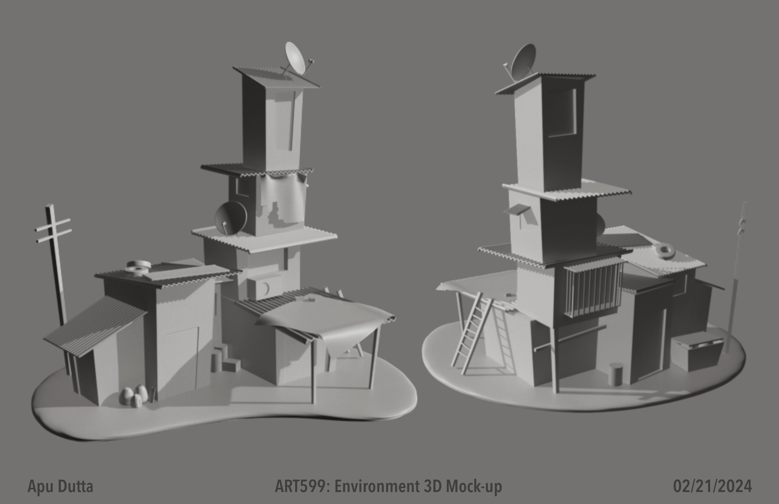 This environment was modeled traditionally using a variety of materials while incorporating a few props that were modeled in Maya and Zbrush and 3D printed to fit the scene. The primary materials used in this scene were foam board and balsa wood.