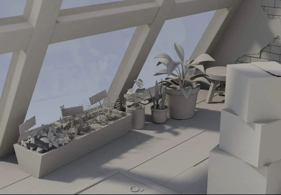 This scene was modeled in Maya and Houdini. All the hard surface objects were made in Maya and all the organic modeling for the plants was done procedurally in Houdini. Everything was textured by hand in Substance Painter. The final scene was composed and lit in Maya and rendered using Arnold. Here are some WIP images as well as the thumbnails and concept art I did for this project.